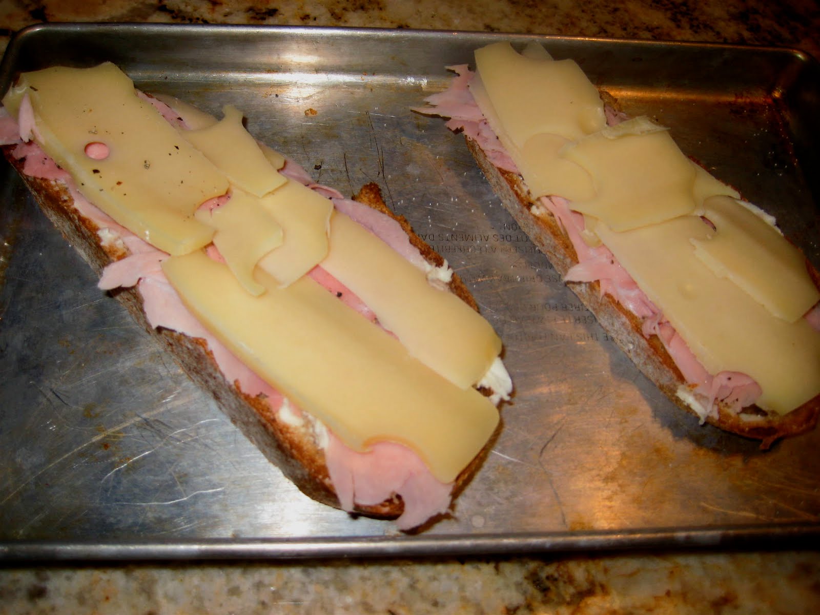 Butter the bread thoroughly and place the ham in an even layer on top of the bread. Sprinkle with salt and pepper and then spread the cheese in an even layer on top of the bread. Though most versions of the croque-monsieur have you add another slice of bread on top (decked with béchamel for a fancy version or with an egg to make a croque-madame), my Parisian croque-monsieur was served open-faced, and I enjoyed it very much that way. Either way, place the croque-monsieur in the heated oven and let cook about 10 minutes until the cheese is melted and the bread is toasted.